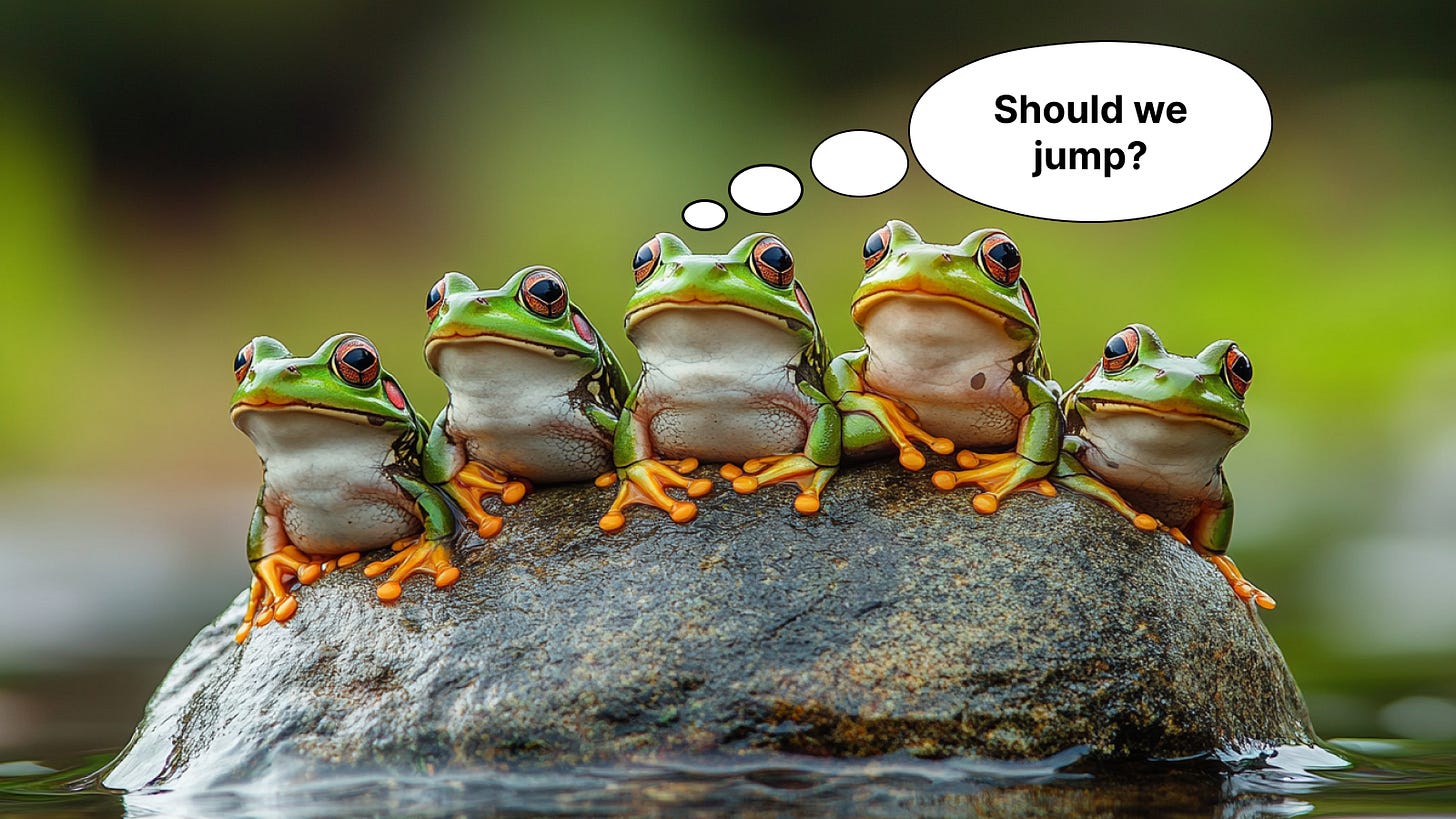 Well, folks, today’s tale is about frogs, stones, and that tricky business of making a jump. Yeah, you heard me right. We’re talking about how corporations often find themselves stuck in a swamp of indecision. I call it the “5 Frogs on a Stone” dilemma.