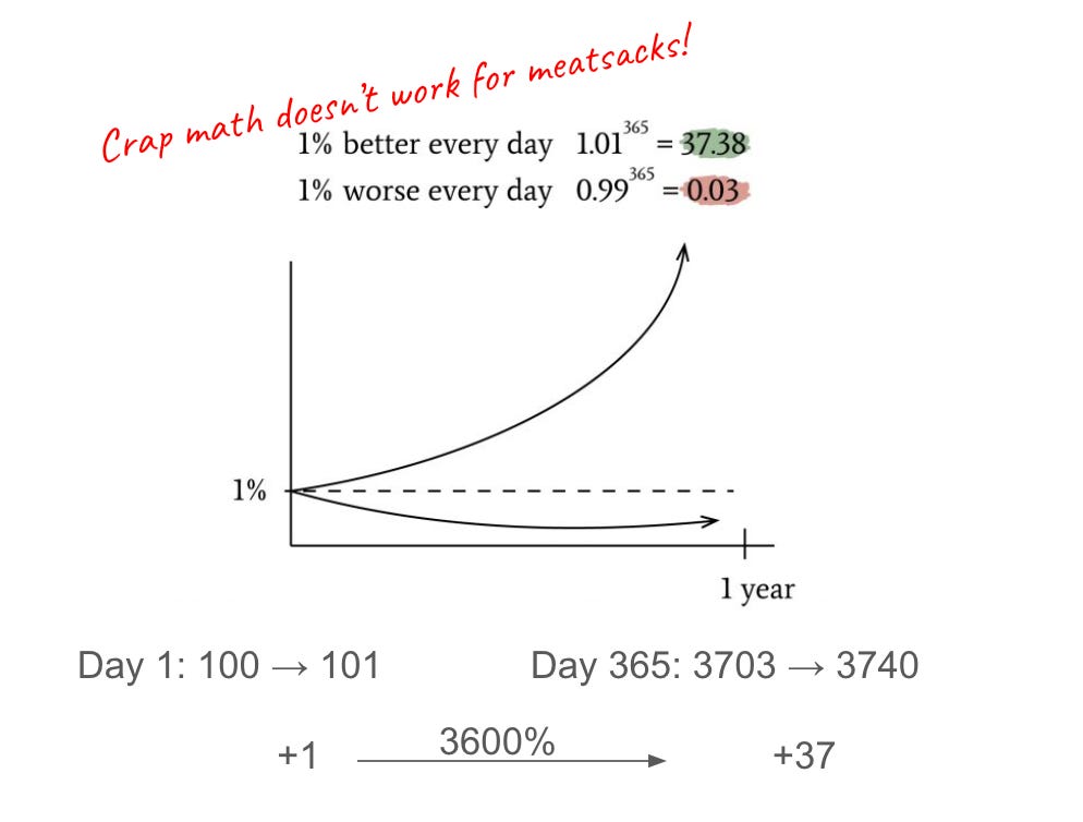 And these LinkedIn suckers. Posting this 1% every day crap from Atomic Habits from James Clear. Sure, continuous improvement is great, but grow a brain. The 1% thing is exponential. The base increases, so the absolute value you need to add grows too. On day 1, say you have a value of 100 you need to increase by only 1, but on day 365, you need to increase by 37 to get to 3740. That’s a 3600% increase! If you start with a habit for 15 minutes on day 1 and keep up with this 1% crap, by the end of the year, you’re looking at 9 hours. Boom, MFers… it doesn’t work. Math doesn’t work here. Yes, we’re stupid meatsacks, homage to Skippy, so biological growth is possible, but 37x better in one year? Come on…